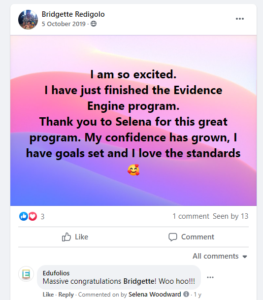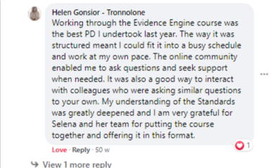 “Working through the Evidence Engine course was the best PD I undertook last year. The way it was structured meant I could fit it into a busy schedule and work at my own pace. The online community enabled me to ask questions and seek support when needed. It was also a good way to interact with colleagues who were asking similar questions to your own. My understanding of the Standards was greatly deepened and I am very grateful for Selena and her team for putting the course together and offering it in this format.“”