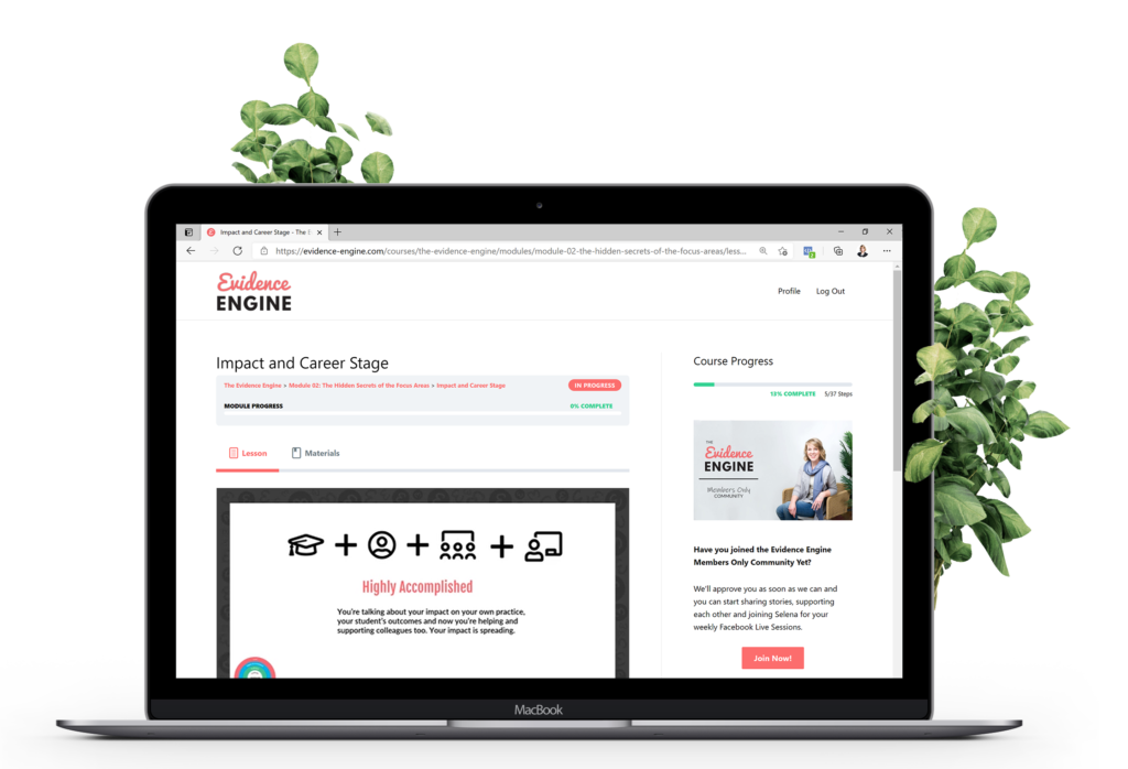 The proven, step-by-step course by evidence coach Selena Woodward, teaches you how to see the evidence in the everyday. How to see how you’re already hitting the standards and to confidently create evidence that will pass accreditation, portfolio assessment and (most importantly) help you improve the impact you’re having in your classroom.